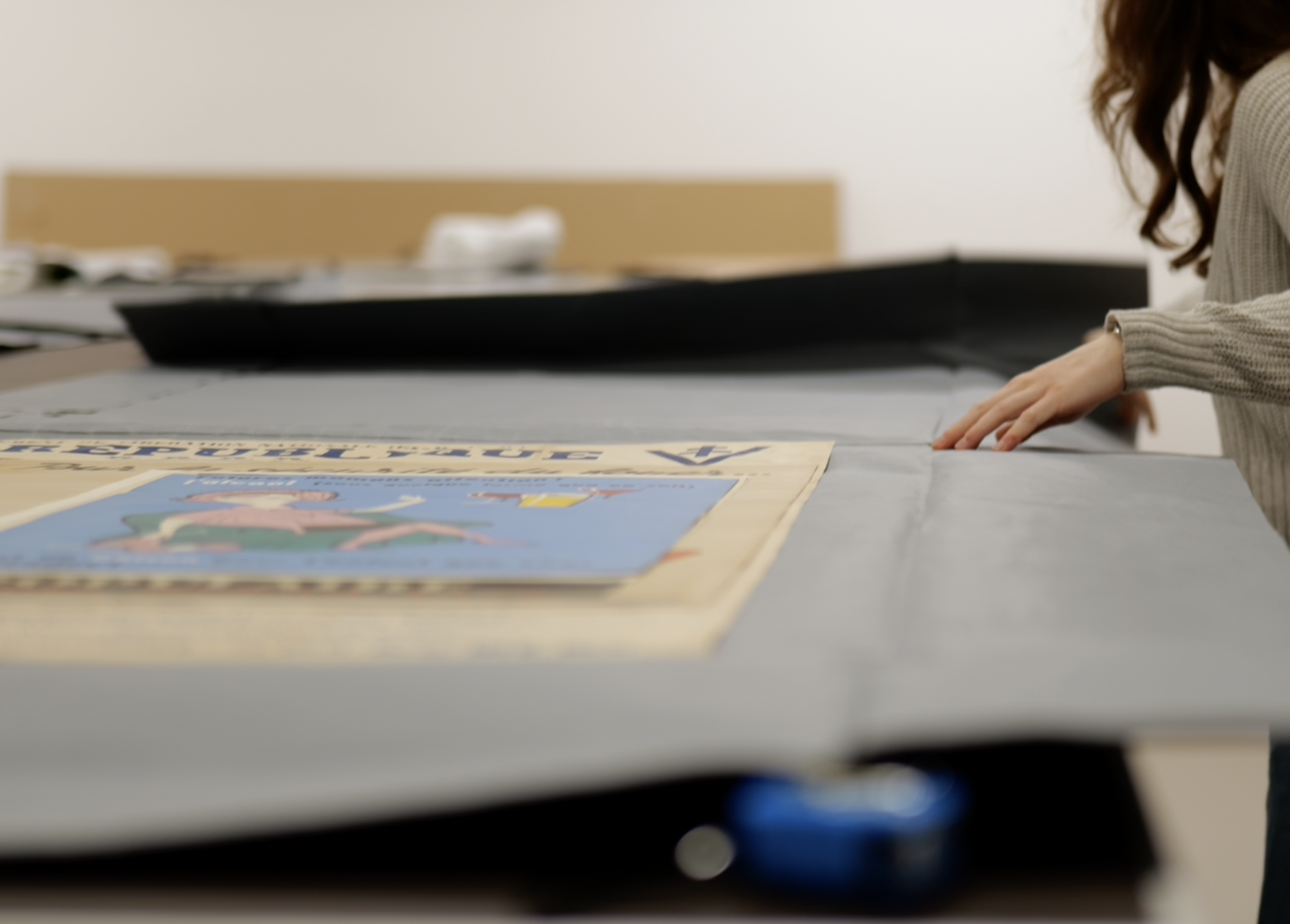 Tifaine Doré, régisseuse des œuvres, invite à sa suite dans les locaux de service de La Contemporaine. Il est 10h, pile à l’heure ! Derrière la lourde porte métallique, il faut emprunter les escaliers réservés aux employés, direction le 1er étage. Les pas experts de Tifaine traversent un couloir servant un ensemble de bureaux vitrés. Si on y jette un œil, les affiches des dernières expositions et des événements culturels nationaux sont bien visibles, épinglées sur les murs. Sur les bureaux, s’entassent les archives et les derniers documents administratifs de l’exposition temporaire : Couper, coller, imprimer qui se tient au musée des mondes contemporains, du 19 novembre 2025 au 14 mars 2026. C’est la dernière salle du couloir qui nous accueille finalement. Semblable à un atelier d’artiste, l’espace est propice à la manipulation des œuvres : un mannequin jonche une table de découpage de tissu et des outils s’empilent dans des caissons. C’est ici que se tiendra l’entrevue.